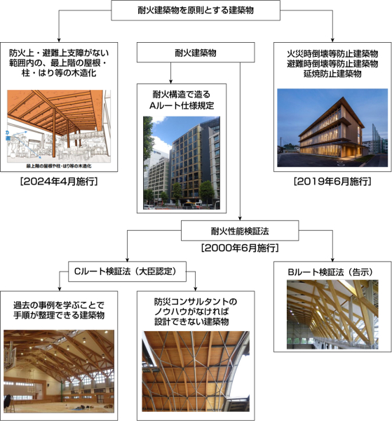 耐火建築物を原則とする建築物の一部または全部を木造とする設計手法の分類
